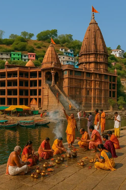 The Omkareshwar Jyotirlinga is located in Khandwa district, Madhya Pradesh, on the Mandhata Island in the Narmada River. It is well connected by road and rail. The nearest railway station is Omkareshwar Road Station (12 km), and the nearest airport is Indore Airport, approximately 77 km away.